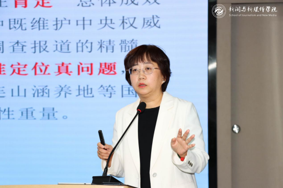 随后,苏蕾副教授从新闻理论角度对王文志的系列报道进行了解析。她分析了王文志记者报道中独特的“国家意志与地方执行落差”框架,以及其如何通过精准的数字和权威的消息来源构建报道的公信力。苏蕾老师指出,王文志记者的成功实践表明,在中国语境下,调查报道完全可以做到既坚持正确导向,又实现深刻的监督价值,是“马克思主义新闻观”与“专业主义精神”相结合的典范。