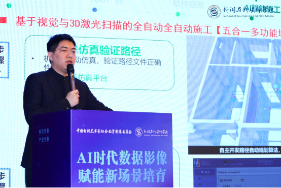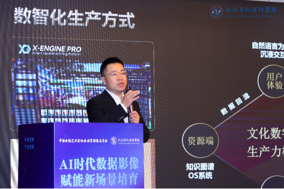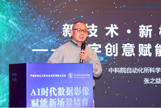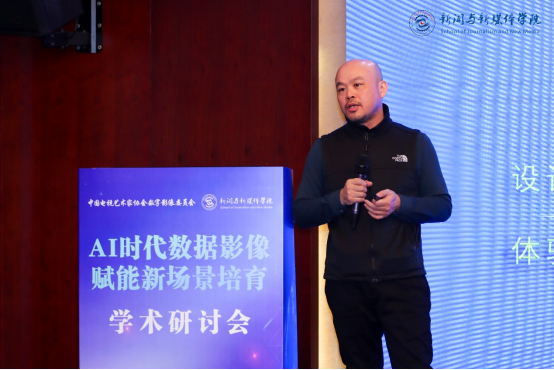 中国传媒大学动画与数字艺术学院教授张歌东梳理了影像发展的四大阶段,从模拟影像、数字影像、虚实结合影像到AI时代的“高维影像”,提出影像已实现从视网膜感知到大脑认知的升维突破。他聚焦空间叙事理念,通过VR大空间应用、媒体建筑光影景观等案例,探讨了数据影像在跨屏创作、公共空间体验等领域的创新可能,呼吁加强技术艺术交叉人才培养。