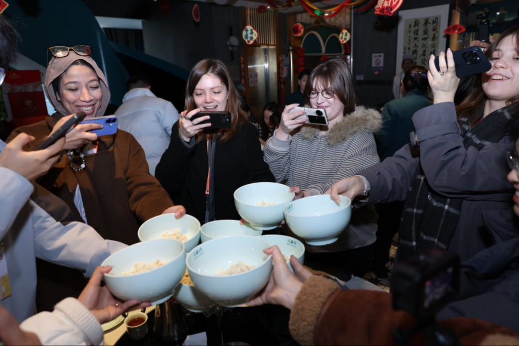 市井烟火气,最抚凡人心。回民街的灯笼长廊下,老铜锅中翻滚的羊肉泡馍、油亮诱人的腊汁肉夹馍成为镜头焦点,吹糖人手艺人与中外游客的互动场景,尽显美食民俗与城市温情。在掰泡馍体验环节,青年创作者们特写记录手工掰制馍粒的指尖动作,非遗传承人演示的炖煮火候与调料配比,以及第一口品尝时汤汁浸润馍粒的满足表情,让柬埔寨青年TAN SOPHEA直呼:“这不仅是美食,更是一种充满仪式感的文化体验。”